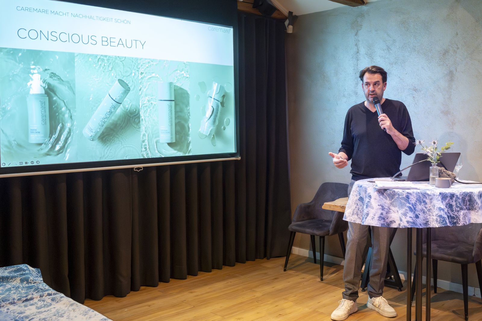 Die Location selbst wirkte wie eine natürliche Verlängerung der Markenidee – hell, offen, reduziert und gleichzeitig warm. Zwischen Drinks, sanftem Licht und entspannter Atmosphäre entstand ein Gefühl von entschleunigter Modernität. Gäste konnten die Produkte nicht nur ansehen, sondern unmittelbar erleben: Texturen auf der Haut spüren, Düfte wahrnehmen, Fragen stellen, Hintergründe verstehen. Genau dieser persönliche Zugang machte den Abend so besonders. caremare präsentierte sich nicht als klassische Kosmetiklinie, sondern als Haltung – eine Verbindung aus Wirksamkeit, Design und Verantwortung.