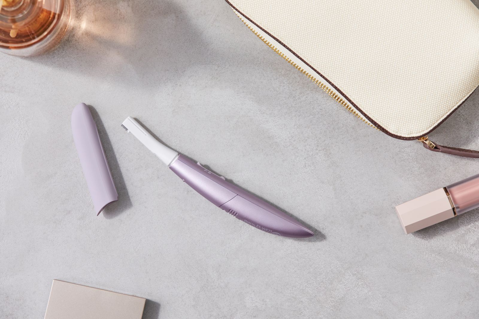 Leicht, kompakt und besonders hautfreundlich, bringt der Trimmer Augenbrauen und Gesichtshärchen in Form. Der flexible Schwingkopf passt sich den Konturen des Gesichts an, während zwei hypoallergene Edelstahlklingen feine Härchen sanft entfernen. Ob Oberlippe, Kinn oder Wangen – der ES-WF71 sorgt für glatte Haut und ein perfektes Make-up-Finish. Mit nur 31 g ist er ideal für die Handtasche und immer bereit für einen Touch-up unterwegs.
