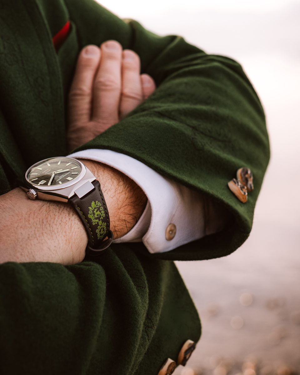Ein besonderes Highlight: das handgefertigte Armband aus braunem Kalbsleder. Mit moosgrüner Kontrastnaht und einem Design, das an traditionelle Miesbacher Trachten erinnert, bringt es authentische Handwerkskunst ans Handgelenk. Ein echtes Stück „Dahoam“ – stilvoll, warm und charakterstark – kombiniert mit optionalem Kautschuk- und Edelstahlarmband für maximale Vielseitigkeit.